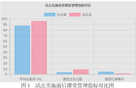 为评估 AI 考勤与行为分析赋能课堂管理的效果,本研究对试点班级在实施前后的关键指标进行如下对比分析。主要考察了学生出勤率、课堂互动次数以及课堂纪律事件数量三项指标的变化。试点实施前,两个班级平均出勤率约为88%,课堂上学生主动互动(如回答问题、讨论发言)的平均次数为每课 4 次左右,每次课堂发生课堂违纪(例如睡觉、玩手机等)事件约 5 起。经过一个学期的智慧课堂管理试点后,出勤率提升至约 96%,课堂人均互动次数提高到每课 9次,课堂违纪事件显著下降到平均每周 1 起左右。这些数据表明,引入 AI 考勤和行为分析系统后,课堂管理的各项指标均有积极改善。图 1 直观展示了试点前后相关指标的对比变化。
