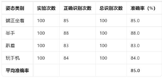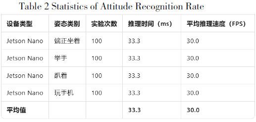 Through these two tables, the experimental results of the system in terms of attitude recognition accuracy and real-time inference speed can be clearly displayed.