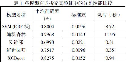 本研究对比 5 种机器学习模型:逻辑回归、K 近邻、 SVM、随机森林、XGBoost。为确保实验结果的稳健性与通用性,本研究采用 5 折分层交叉验证(Stratified K-Fold CrossValidation)对上述模型进行评估,系统流程图(如图 1 所示)。